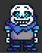 His arms are by his sides, and he appears standing up straight and still, facing the player like UnderTale Sans. He wears a slightly tattered blue cape that appears to be